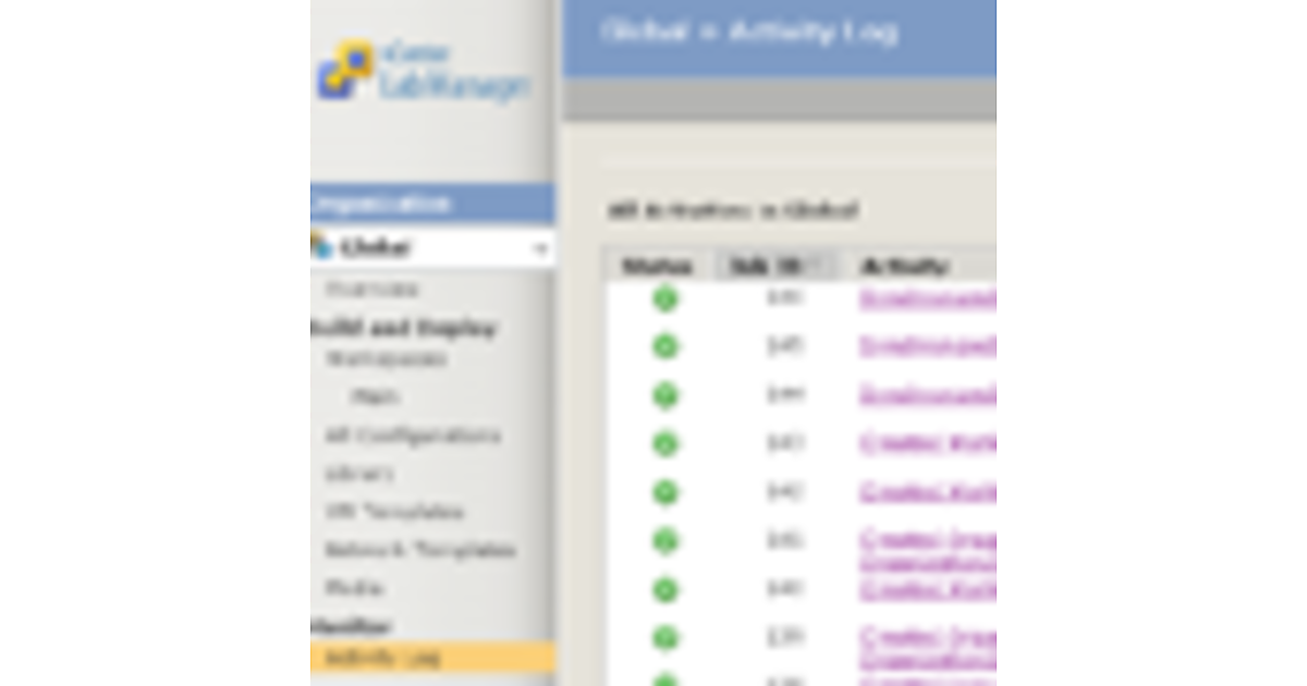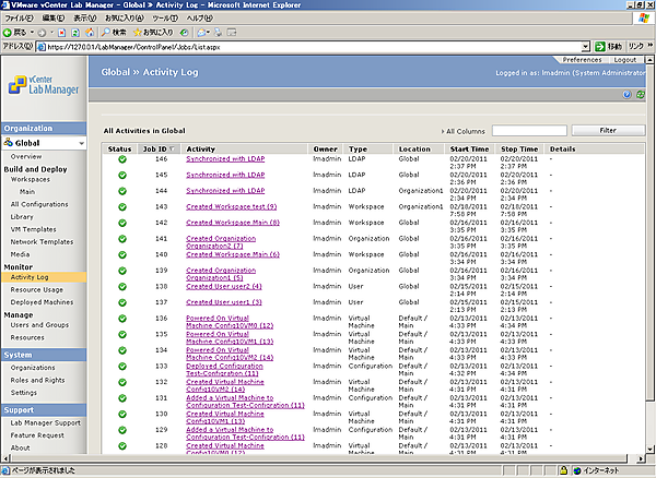 [1-1]左ペインで[Activity Log]をクリックします。Lab Manager で実行されたタスクの一覧が表示されます。エラーが出ている場合は原因の調査を行います。