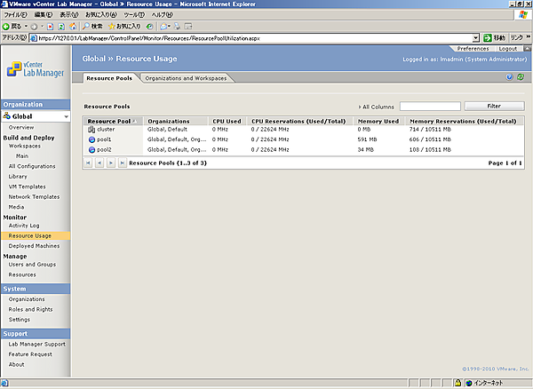 [1-2]左ペインで[Resource Usage]をクリックし、[Resource Pools]タブをクリックします。このあとLab Managerに割り当てられたリソースプールの各リソース使用率の一覧が表示されます。
