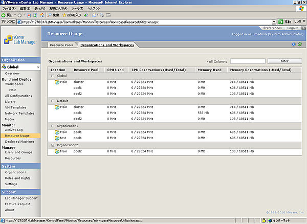 [1-3]左ペインで[Resource Usage]をクリックし、[Organizations and Workspaces]タブをクリックします。Lab Manager上のワークスペースでは、それぞれどの程度のリソースを使用しているかを確認できます。リソースの使用状況は、各ロケーションのグループごとに表示されます。