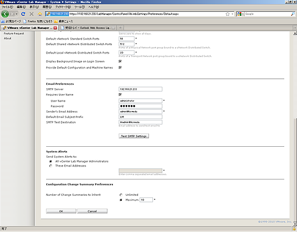 [2-2]以下の[Email Preferences]の項目に必要な情報を入力し、[Test SMTP Settings]をクリックします。
