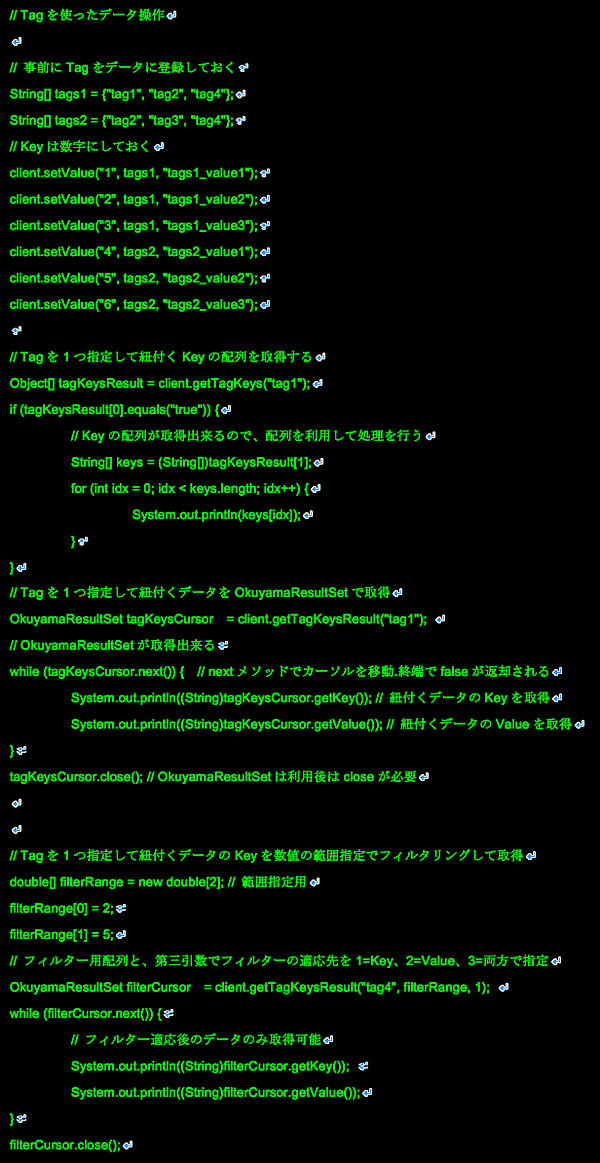 両方とも複数のTagを指定してANDやORでの取得に対応しています。また、OkuyamaResultSetを利用する後者は取得時にKeyやValueに対してフィルタリングの条件をして取得するデータを限定する事が可能です。