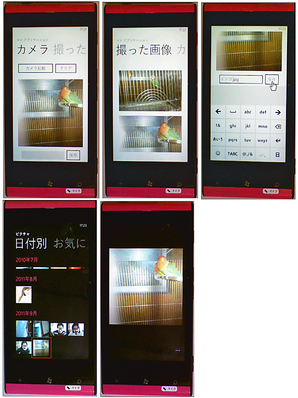 | 図4:実機(IS12T)のカメラ機能で撮った写真が、2ページ目のListBoxに順次追加される。画像ファイル名を指定して[保存]ボタンをタップすると、PictureHUBには今撮った写真が保存されている(クリックで拡大) |