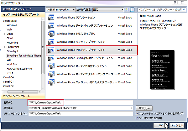 | 図5:Windows Phone ピボット アプリケーションを選択する(クリックで拡大) |
