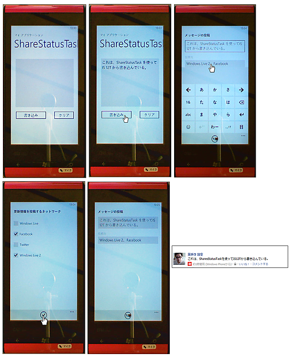 ShareStatusTaskはWindows Phone OS 7.1から追加されたLauncherです。これを使うとユーザーのステータスをソーシャルネットワークサービス(SNS)で共有することができます。今回はFacebookと共有しています。