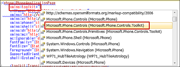 | 図4:toolkitという名前空間を定義する。xmlms:toolki=”と記述し、表示される値の一覧から、「Microsoft.Phone.Controls(Microsoft.Phone.Controls.Toolkit)」を選択する(クリックで拡大) |