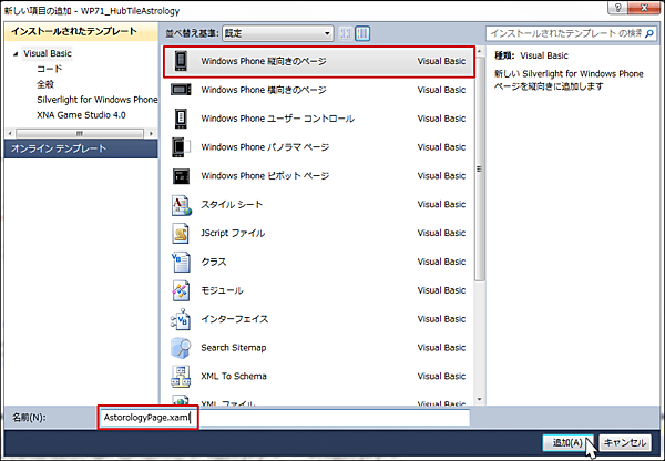 「プロジェクト(P)/新しい項目の追加(W)」と選択して、「Windows Phone 縦向きのページ」を選択します。「名前(N)」には「AstorologyPage.xaml」と指定します(図6)。
