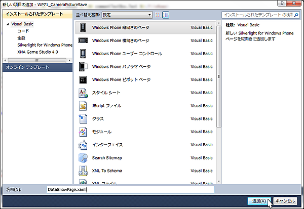 VS2010メニューの「プロジェクト(P)/新しい項目の追加(W)」と選択し、「Windows Phone 縦向きのページ」を選択します。「名前(N)」にはDataShowPage.xamlと入力します(図7)。