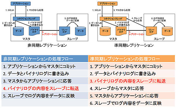 | 図4:非同期レプリケーションと準同期レプリケーションの処理フローの比較(クリックで拡大) |