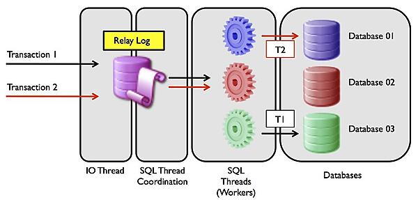 スレーブのSQLスレッドがマルチスレッド化が可能になり、リレーログからデータへの適用を並列化できます。MySQL 5.6.3の時点では別のデータベースへの変更を並列で適用してコミット可能になっています。今後テーブルごとに並列処理ができるように開発を行っています。