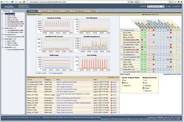 MySQL Enterprise Monitorは複数のMySQLの稼働状況をブラウザ経由で一覧監視するツールです。監視対象はハードウェアリソースの利用状況からMySQLのセキュリティやパフォーマンスに関するまで140項目以上にわたります。監視対象のMySQLに問題が発生してから報告するのではなく、これまでのMySQLの運用ノウハウを元にして問題の兆候をとらえ、事前に改善策をデータベース管理者に提示します。監視状況は画面上に表示されるだけではなく、メールやSNMPを経由して通知します。レプリケーション構成を運用する環境では、監視マネージャが自動的に構成を解析し、サーバ間でのデータ転送の遅延や内部スレッドの稼働状況を監視します。