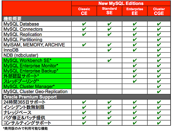 有償版は4つのエディションに分かれています。ただし、InnoDBの利用できないClassic Editionは組み込み用途限定となります。また、2011年12月現在は日本語でのサポートは平日9時から17時の間のみとなっています。