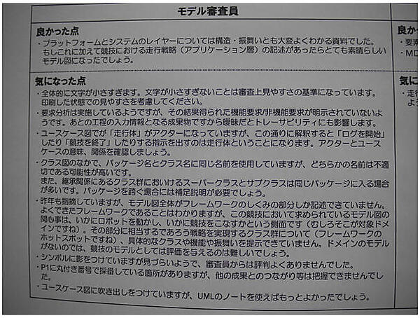 - [吉田] 私はやっぱり担当してたユースケース図のところ。「走行体がアクターになっている」のがダメだったみたい。実はいろいろ迷って最後に追加した部分なので、特にね。「システムとしての走行体」と、「ハードとしての走行体」が頭の中でごっちゃになっちゃったかも。走行体は、「対象とするシステムそのもの」として扱ったほうが良かったみたい。あと、ユースケース記述もたくさん書いたのだけど、「文字が小さすぎる」という指摘されちゃってるし。もっとポイントをしぼったほうが良かったかも。