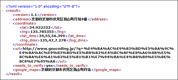 例えば、京都府京都市伏見区桃山町丹後9番地と入力して返されるXMLは、図3のようなXMLです。