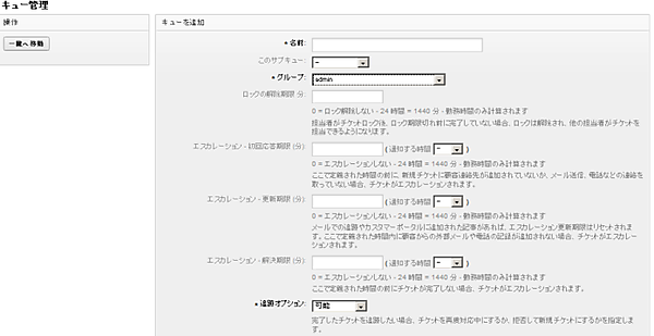 キューの作成は、「管理」の「キュー」をクリックし、「キューの追加」より行います。作成するキューには、以下の項目を設定します。