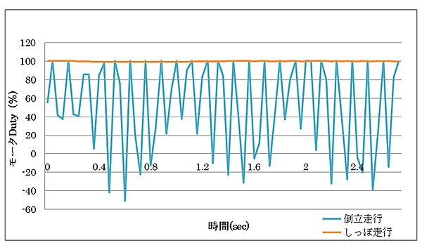 図2から分かるように、しっぽ走行ではモータへのDuty値は常に100%(マイナス値はモータ逆転を表します)であるのに対して、 倒立振子ではバランスを取らなければならないのでDuty値が絶えず変化しているのが分かります。