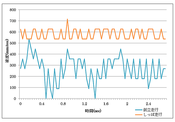 その結果、前進速度もしっぽ走行の平均速度が580mm/secに対して、倒立振子では276mm/secとなっています。