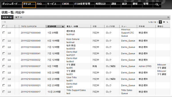 担当者がインシデントを確認するには、「管理」の「チケット」をクリックし、「状態一覧」を選択します。表示されるインシデントは、対応中と完了に分かれており、対応中のインシデントには以下のような情報が表示されます。