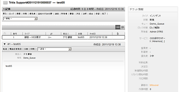 上の図のインシデントをクリックすると、以下の図のようにチケットの内容を確認できます。