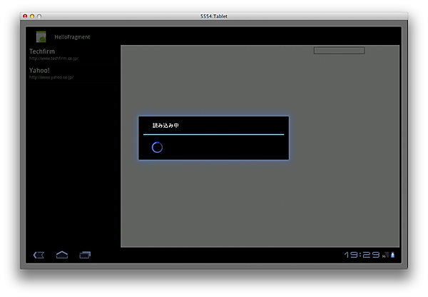 Fragmentの修正も完了しましたので気になる点の修正に入りましょう。まずはWebページの読み込みの際に表示する「読み込み中」ダイアログを表示するように修正します。