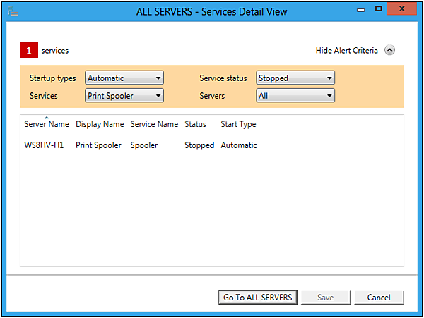 上の画面は「service」のAlert表示画面です。ここでは、全ての登録サーバーにおいて、スタートアップの種類が自動のPrint Spoolerサービスが停止した場合にAlertを表示する設定になっています。
