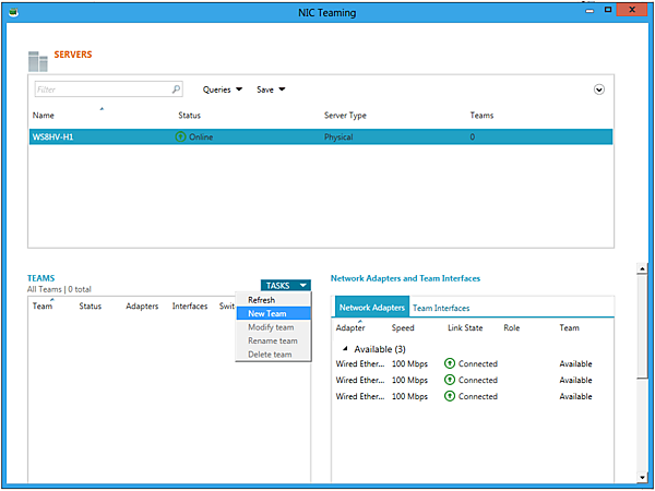 NIC Teaming の設定画面となります。Teamingを行うサーバーを選択し、TEAMSからNew Teamを選択します