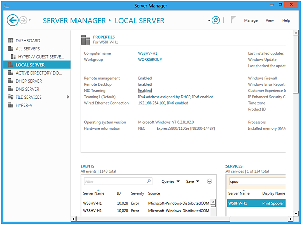 NIC Teamingの設定を行います。Server ManagerよりLOCAL SERVERを選択します。表示されるNIC Teaming のDisabledを選択します。