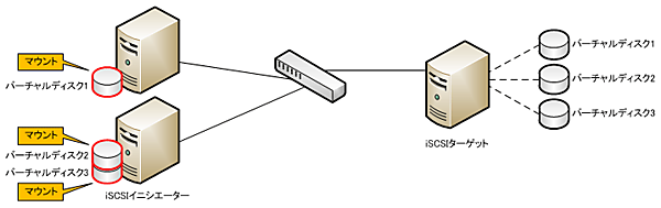 iSCSIターゲットは、ネットワーク越しに、バーチャルディスクをローカルディスクのようにマウントできるようにする機能です。