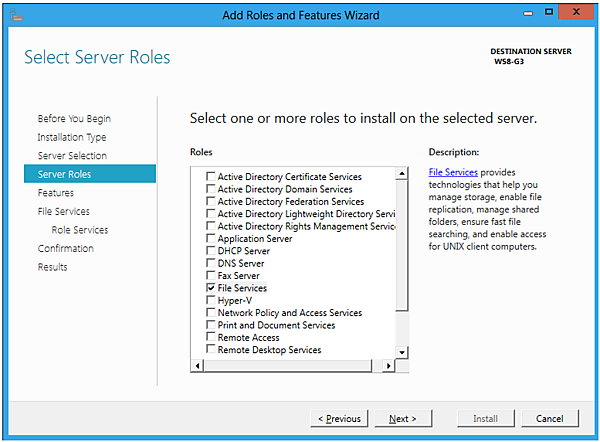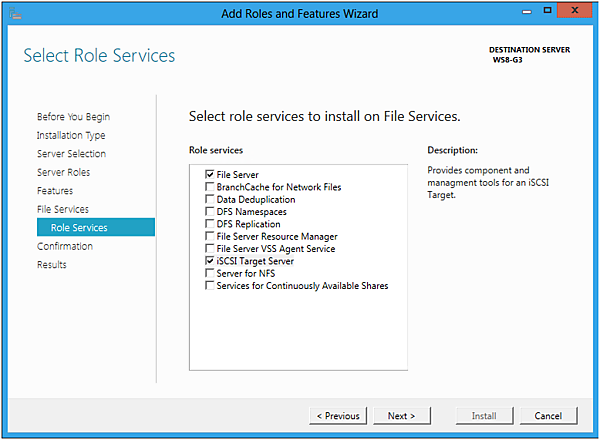 次に、File ServicesのFile ServerとiSCSI Target Serverを追加します。