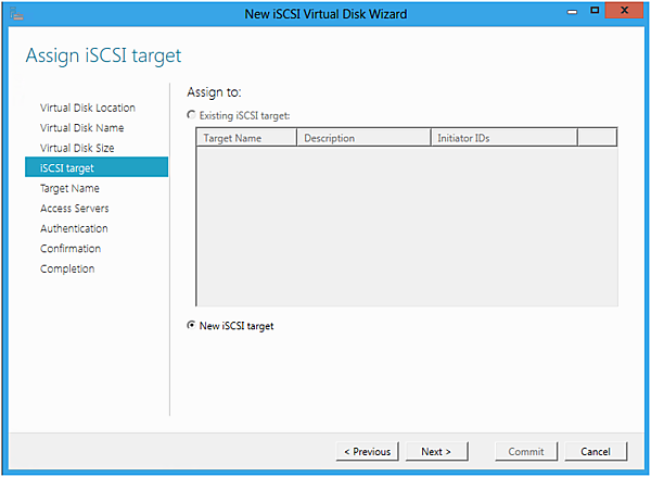 バーチャルディスクを割り当てるiSCSIターゲットを選択、もしくは新規作成します。初回は、新規作成を行います。