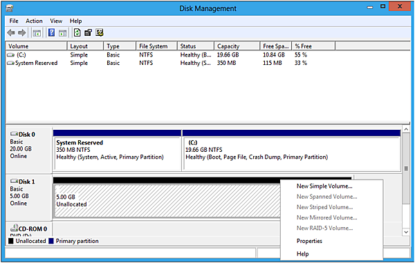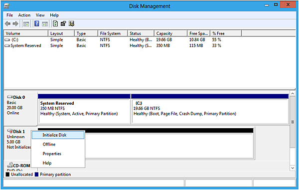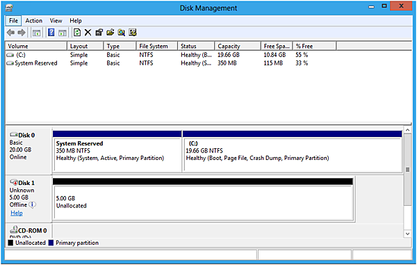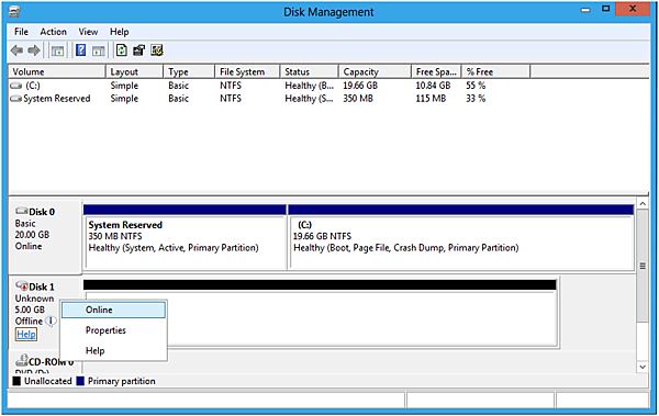 通常の物理ディスクと同様の設定を行います。Onlineに設定します。図ではDisk1として認識されています。