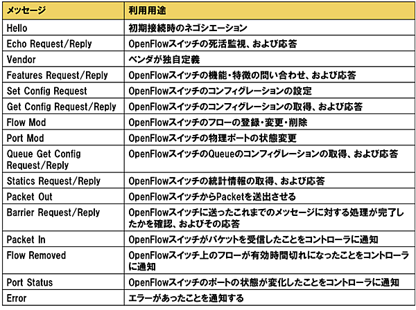 OpenFlowプロトコルに従ってやり取りされるメッセージを列挙すると以下の表のようになります。