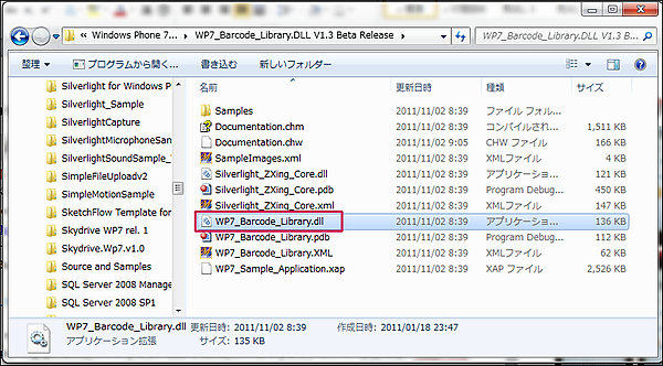 | 図1:WP7_Barcode_Library.DLL V1.3 Beta Releaseフォルダ内にWP7_Barcode_Library.dllがある(クリックで拡大) |