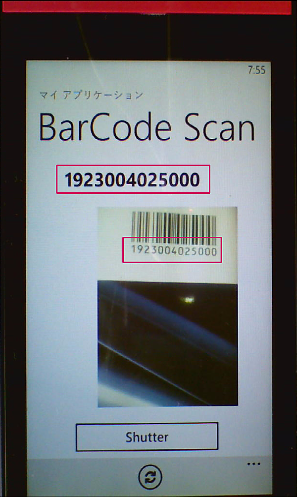 実機にプログラムをデプロイし、表示される矩形の中にバーコードを写し、ピントが合った時点で[Shutter] ボタンをタップします。うまくバーコードを認識できれば、バーコードの数字が表示されます(図2)。バーコードが認識できない場合は、「やり直してください。」と表示されます。最下部にあるアイコンは「リフレッシュ」のアイコンです。タップすると、再度バーコードのスキャンが開始されます。バーコードにピントがきっちり合っていないと、うまく認識できませんので、注意してください。被写体にピントを合わせるには、実機のシャッターボタンを長押しするとピントを合わすことができます。
