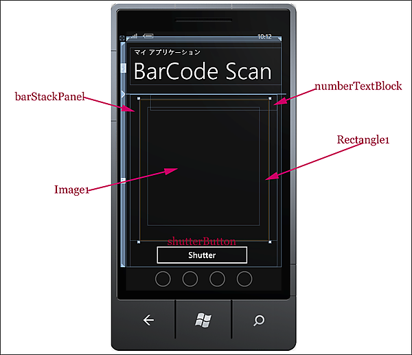 x:NameがPageTitleというTextBlockのTextプロパティに「BarCode Scan」と指定します。ツールボックスから、StackPanelコントロールを1個、その子要素として、TextBlockコントロールを1個、Imageコントロールを1個配置します。StackPanelのOrientationはデフォルトのVerticalです。Buttonコントロールを1個配置します(図3)。