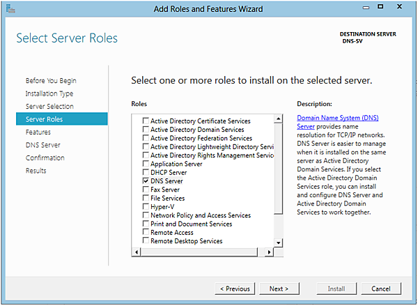 ウィザードが起動後、[Server Roles]まで進めます。[Roles]の項目で[DNS Server]にチェックを入れ進めていきます。