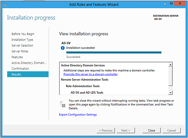インストール完了後、[Promote this server to a domain controller]をクリックして初期設定を行います。