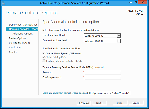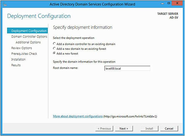 ウィザードが開始されます。[Specify deployment information]では、最初のフォレスト、ドメインコントローラとなるので[Add a anew forest]を選択します。[Root domain name]には、ドメイン名を入力します。