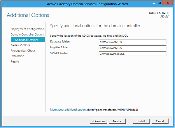 データベース、ログファイル、SYSVOLのフォルダの入力画面です。必要のない限り変更の必要はありません。