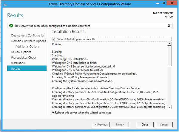 以上で初期設定が完了し、ドメインコントローラとして利用することが出来ます。表示された結果より、DNSサーバーも同時にインストールされたことも確認できます。