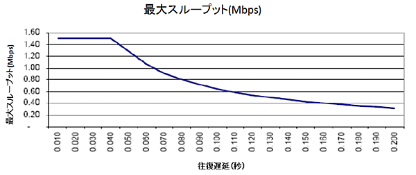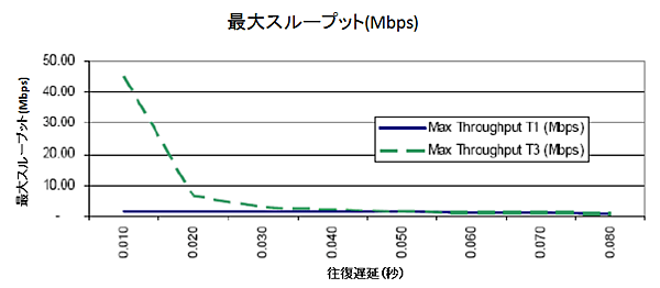 | 図1:T1(1.544Mbps)回線の遅延によるスループットの変化(クリックで拡大) |