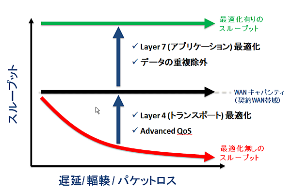 このように、WAN最適化装置では複数のアプリケーション最適化技術までも組み合わせる事により、本来は契約しているスループットの帯域が最大占有帯域となりますが、実際には契約WAN帯域以上のスループットを提供する事ができるようになっているのです(図4参照)。