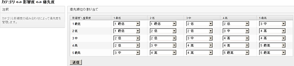 | 図5:「カテゴリ -> 影響度 -> 優先度」の設定画面(クリックで拡大) |