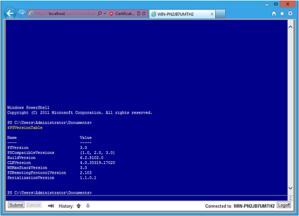 PowerShellの画面ではバージョンの参照を行っています。TABによる補完もできます。ブラウザベースで動作するので、社外からアクセスして利用することも可能です。急なサーバーの管理にも対応できます。