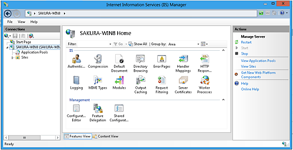 [Internet Information Services (IIS) Manager]の画面を見ると、UIはIIS7.5をさほど変わった印象はありませんでした。