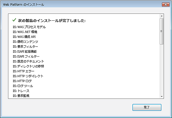 インストールが完了すると、インストールされた製品の一覧が表示されます。[完了]をクリックして画面を閉じ、WebPIも[終了]をクリックして終了させます。