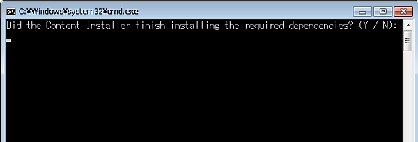 コマンドプロンプトが立ち上がって、先ほど表示された、必要なコンポーネントのインストールが終わっているか確認するメッセージ(画面17)が表示されますので、「Y」を入力し「Enter」キーを押します。次にVisual Studioの拡張機能をインストールして良いか確認されますので(画面18)、再度「Y」を入力し「Enter」キーを押します。