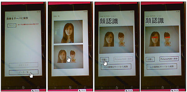 カメラを起動します。カメラは横向きで撮ってください。人物を撮影します。[画像を保存]ボタンをタップすると撮った画像が専用サーバに保存されます。 [データ一覧]をタップすると、サーバに保存された画像の一覧が表示されるので、任意の画像を選択します。すると、「顔認識」の画面に遷移します。選択した画像が表示されていますので、[目隠し]ボタンをタップすると、画像に赤色の「目隠し」が追加されます(図1)