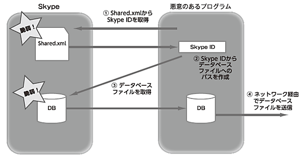 Skype社では、悪意のあるプログラムがインストールされると個人情報が抜き取られると告知しています。情報を抜き取るプログラムを作成するのは非常に簡単です。上記の手順さえ知っていれば、rootなどの特殊な権限は必要ありません。一般的なアプリケーションの権限を使って、/data/data/com.skype.raider/files/shared.xmlを読み取り、Skype IDを取得し、そこからデータベースファイルのパスを作成します。データベースファイルも読み取り可能なので、作成したデータベースを直接読み込んだり、データベースファイル自体をネットワーク経由で送信したりすれば、個人情報を収集することが可能です(図1-1)。