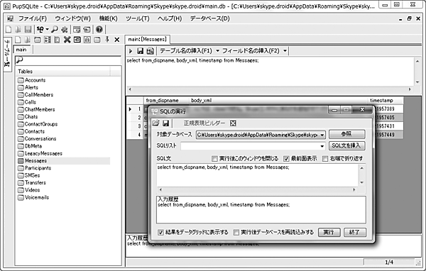 $ sqlite3 /data/data/com.skype.raider/files/(Skype ID)/main.db