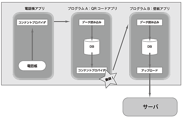 QRコードアプリ(プログラムA)をインストールすると、「連絡先データの読み取り」パーミッションがあることが表示されます。このアプリケーションは当然電話番号にアクセスする必要がありますし、ネットワーク通信を行うパーミッションもないため、ユーザはプログラムAによって連絡先データがネットワーク経由で収集されることはないと判断し、安心してインストールを行います。ここでは、作者の不注意により、プログラムAは電話帳から電話番号を取得してアプリケーション内のデータベースに名前や電話番号などの値を保存し、コンテントプロバイダで無制限に外部に公開しているものとします(図1-4)。
